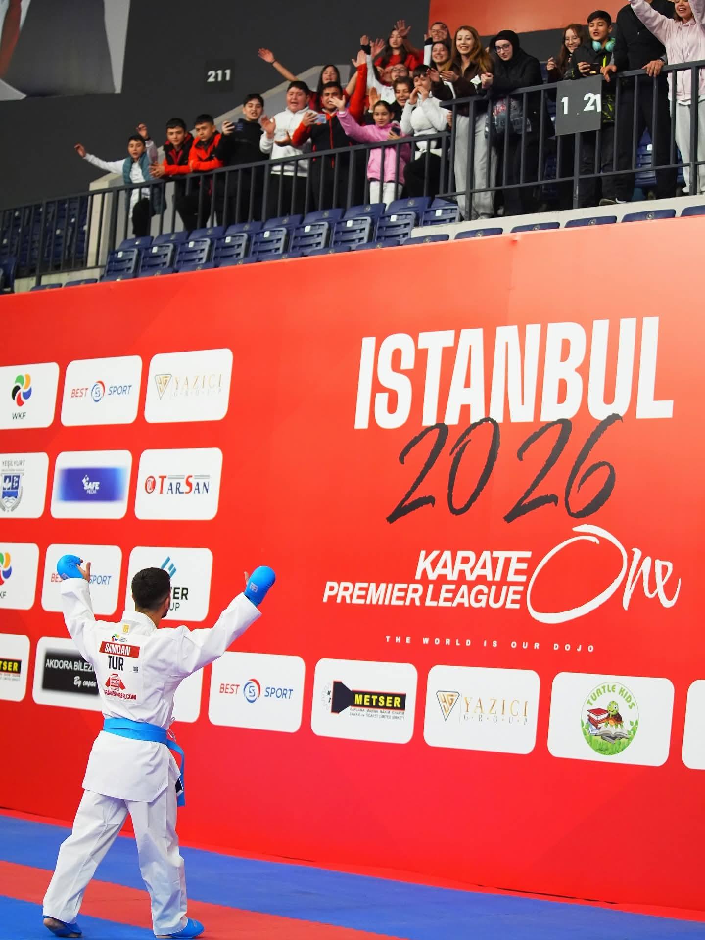 Eray kendisini salonda destekleyen DARES’in küçük karatecilerinin ve babası Adnan Şamdan’ın yanına gitti.