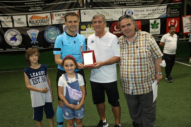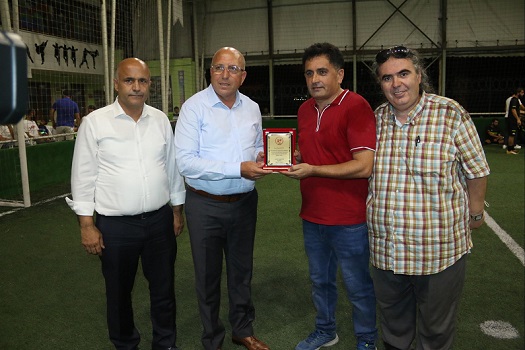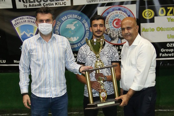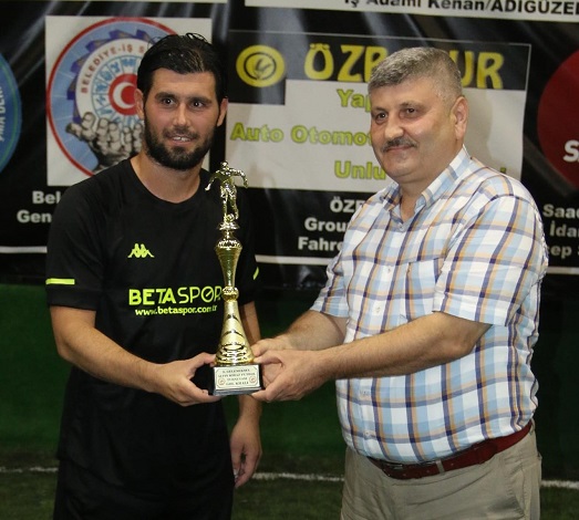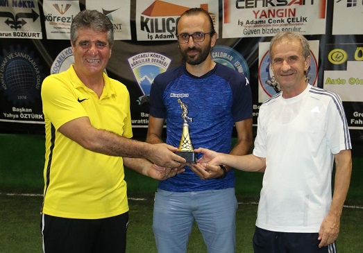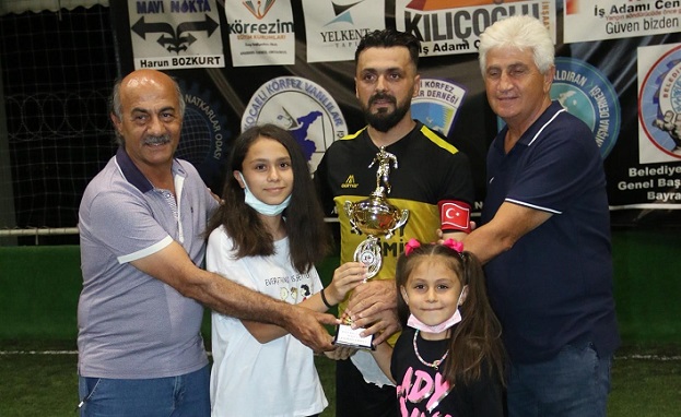 Gol kralı olan Ümit Kahya kupasını Körfez Esnaf ve Sanatkarlar Odası Başkanı Yahya Öztürk'ten aldı.