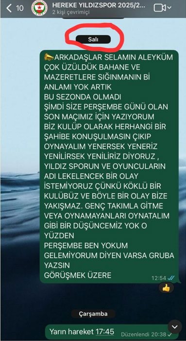 Çetin İnan’nın başkanlığını, Fahri Denli’nin de teknik sorumluğunu yaptığı Hereke Yıldızspor’da futbolcuların ve teknik kadronun yer aldığı WhatsApp grubunda Darıca Martı maçı öncesi Hereke Yıldız Yardımcı Antrenörü Ertunç Can’ın futbolcular için yaptığı paylaşım çok dikkat çekiciydi. Açıklamada şu ifadelere yer verildiği görüldü: Arkadaşlar… Selamun Aleykum. Çok üzüldük, bahane ve mazaretlere sığınmanın bir anlamı yok artık. Bu sezon da olmadı. Şimdi size perşembe günkü son maçımız için yazıyorum.