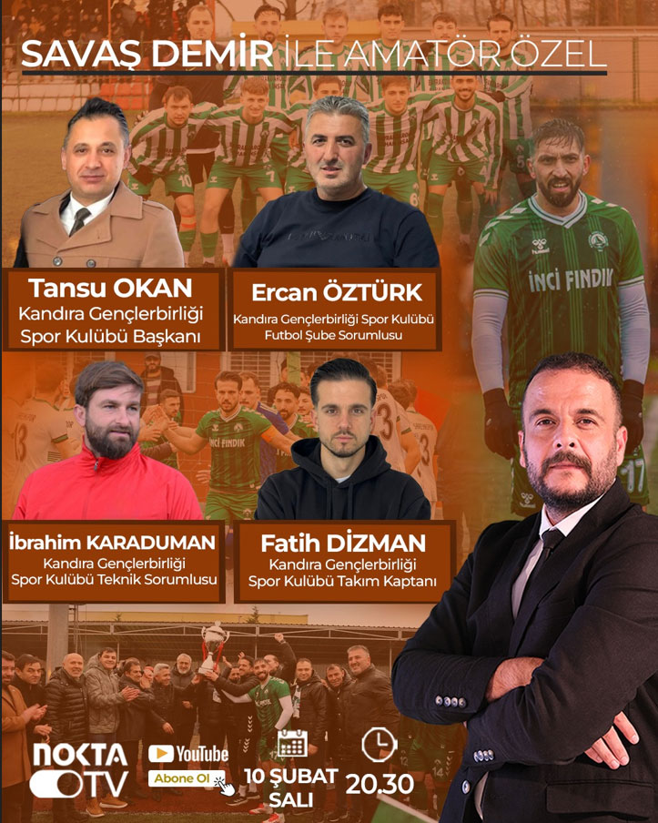 Her salı akşamı Nokta TV’den canlı olarak yayınlanan Savaş Demir ile Amatör Özel programının konuğu Süper Amatör Lig B Grubu’nda normal sezonu zirvede tamamlayan Kandıra Gençlerbirliği olacak.