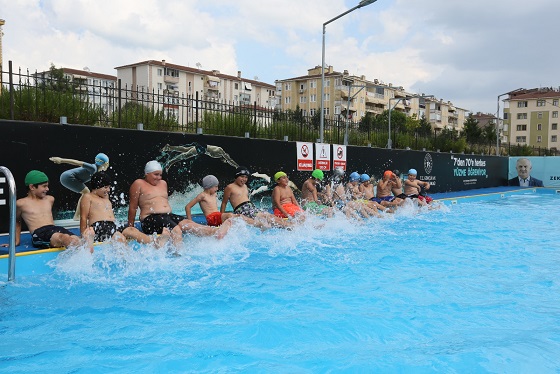 Derince genelinde yaz döneminde de devam eden ‘Yüzme Bilmeyen Kalmasın’ projesiyle birlikte 7-14 yaş arasındaki yaklaşık 2 bin 500 öğrenci ücretsiz yüzme eğitimlerinden faydalanıyor. Yenikent Mahallesi’nde yer alan Şehit Er Emre Kaan Arlı Çok Amaçlı Spor Salonu ve Fatih Sultan Mahallesi’nde bulunan Bahattin Çelik Spor Kompleksi’nde haftanın 6 günü devam eden yüzme kurslarını ziyaret eden Başkan Aygün, burada çocuklar ve aileleriyle bir araya gelmeyi ihmal etmiyor.