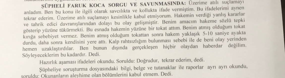 Üzerime atılı suçlamayı anladım. Ben konu ile ilgili olarak savcılıkta kollukta ifade vermiştim. Bu ifadelerimi aynen tekrar ederim. Üzerime atılı suçlamayı kesinlikle kabul etmiyorum. Hakemin verdiği yanlış kararlar ve tahrik edici davranışlarından dolayı bu olay gelişmiştir. Benim amacım hakeme tepki gösterip yüzüne tükürmekti. Bu esnada hakemin yüzüne tokat attım. Benim atmış olduğum tokattan sonra hakem yaklaşık 5-10 saniye ayakta durdu, daha sonra kendisini yere attı. Kalp rahatsızlığım bulunması sebebi ile de beni olay yerinden hemen uzaklaştırdılar. Ben bunun dışında gerçekleşen hiçbir olaydan haberdar değilim. Söyleyeceklerim bu kadardır.