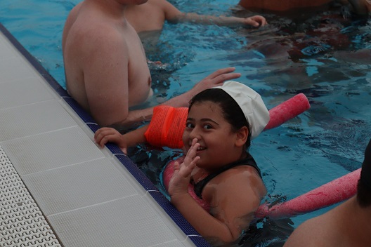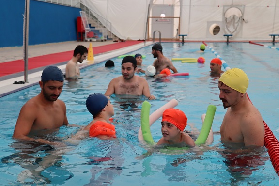 Spor yapan özel çocuklar havuz içinde bol bol stres atıyor.