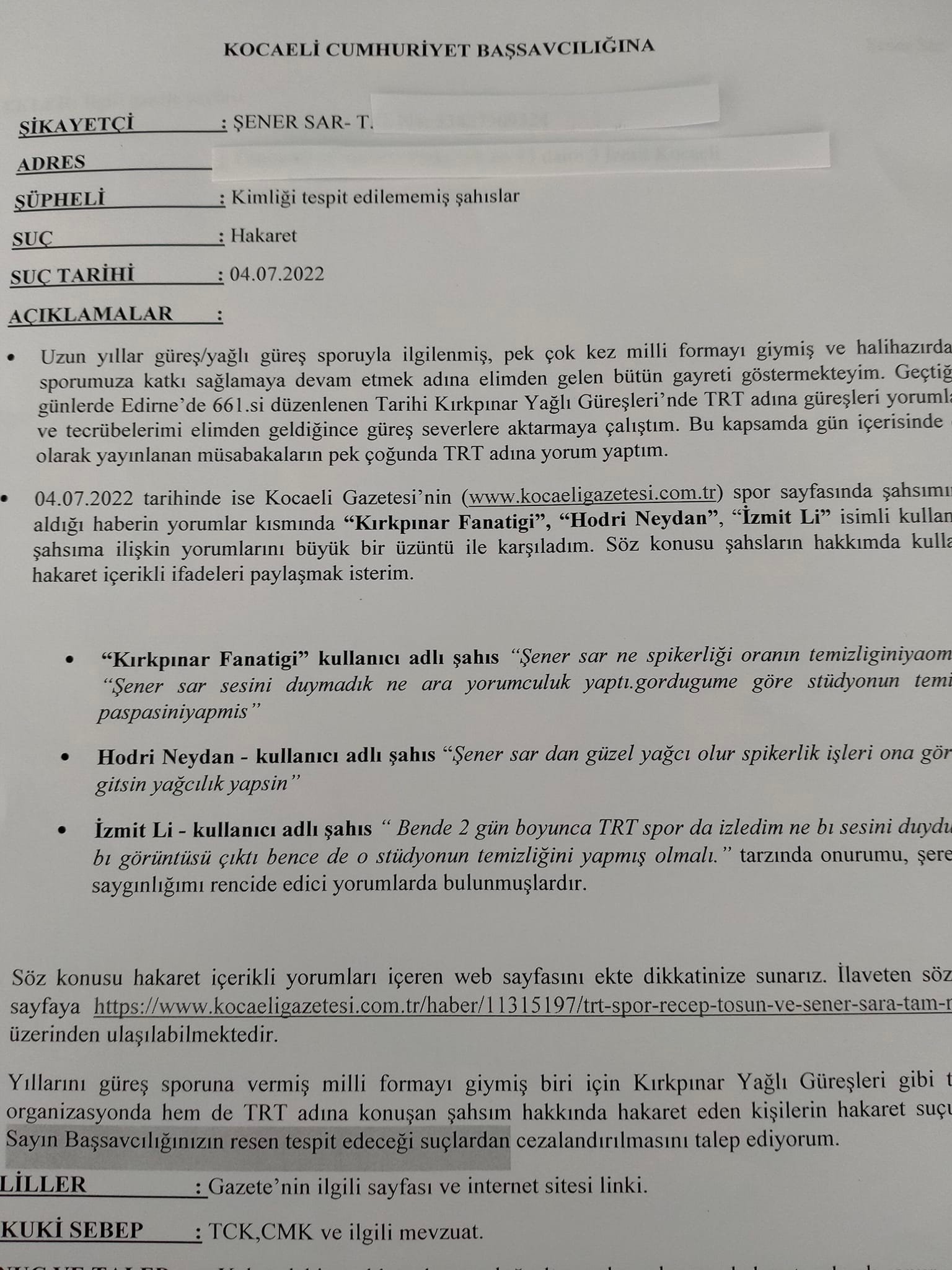 İlimizin başarılı güreş ustalarından, antrenör Şener Sar, TRT Spor’da yayınlanan 661. Kırkpınar Yağlı Pehlivan Güreşleri’nde TRT Spor adına yorumcu olarak görev almış ve hem Spor41’de hem de Kocaeli Gazetesi’nde konu ile ilgili haber yapılmıştı. Şener Sar, Kocaeli Gazetesi’nde çıkan “Şener Sar ve Recep Tosun’a tam not” başlıklı haber için yapılan hakaret içeren yorumlarla ilgili savcılığa suç duyusunda bulundu.