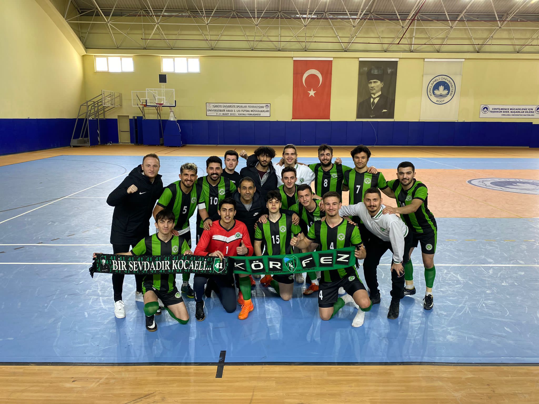Kırklareli Kayalı Yerleşkesi Spor Salonu’nda düzenlenen Türkiye Üniversiteler Arası Futsal 2. Ligi’nde Kocaeli Üniversitesi fırtınası esti. Grubunda 4’te 4 yapan ve müthiş finalde de Tekirdağ Üniversitesi’ni 8-7 mağlup eden yeşil siyahlılar adını 1. Lig’e yazdırarak büyük bir başarıya imza attı.