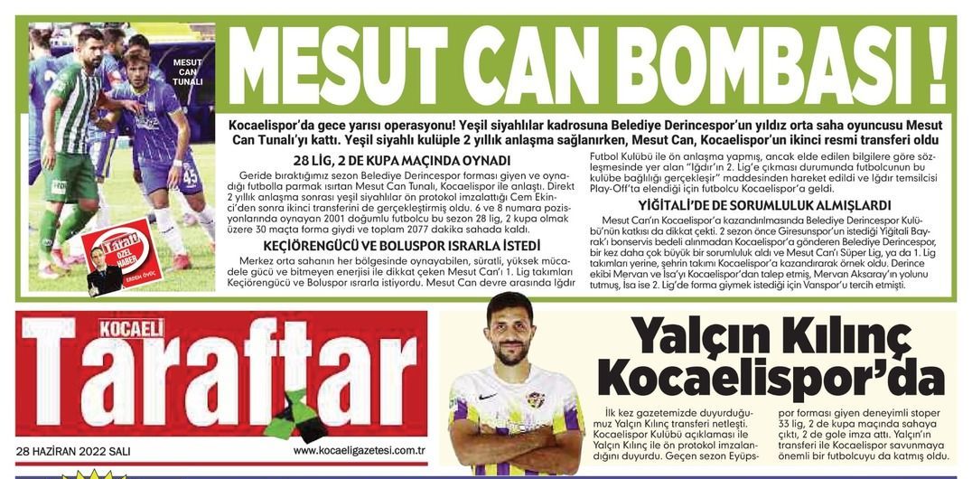 Geride bıraktığımız sezon Belediye Derincespor forması giyen ve oynadığı futbolla alkışlanan orta saha oyuncusu Mesut Can Tunalı, Kocaelispor ile resmen anlaştı. 6 ve 8 numara pozisyonlarında oynayan 2001 doğumlu futbolcu bu sezon 28 lig, 2 de kupa olmak üzere toplam 30 maçta forma giydi ve 2077 dakika sahada kaldı.
