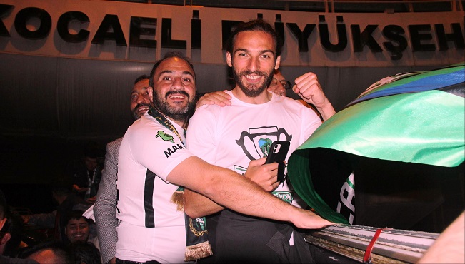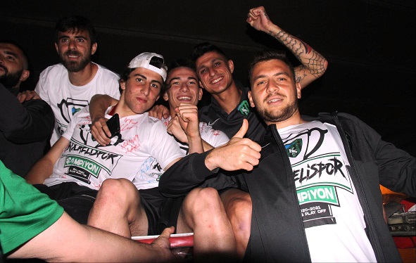 Burada üstü açık otobüs ile Merkez Bankası önünden yan yola inen ve ardından Perşembe Pazarı alanına gelen kafile, taraftarla kucaklaştı. Yaptıkları tezahüratlarla şehri inleten Kocaelisporlular yaktıkları meşalelerle de geceyi aydınlattı.