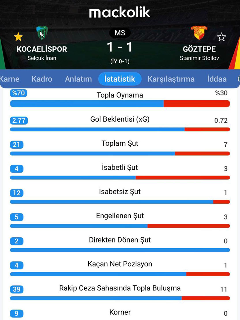Yeşil siyahlılar, Göztepe karşısında bir ara topla oynamada 79’a 21’lik bir üstünlüğe sahip oldu, uzatmalarla birlikte 20 dakika 10 kişi oynadığı maçı da 70’e 30’luk bir oranla maçı tamamladı. 71’e 45 ikili mücadele kazanma, 30’a 32 hava topu kazanma, 9’a 0 korner, 21’e 6 şut, 2.77’ye 0.72 gol beklentisi, 39’a 11 rakip ceza sahasında topla buluşma ve birçok istatistikte rakibine futbol dersi veren Kocaelispor beraberliğe üzülen taraf oldu.