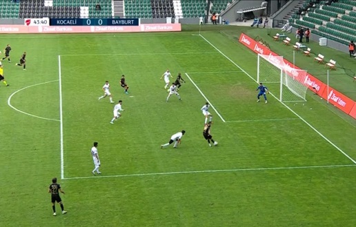 Maça iki takım da kontrollü başladı. Düşük tempolu geçen ilk 45 dakikasında Kocaelispor, İlyas, Tisdell, Semih ve Yiğitali ile zaman zaman kaleyi yokladı. 38’de Bayburt’ta Ali Aydemir’in kafa vuruşunda top üst direkten döndü. 39’da Dilaver’in pasında Diop topu ağlara gönderdi ancak pozisyon ofsayt gerekçesi ile gol değeri kazanmadı. 43’te Bayburt serbest vuruş kullandı, Ali Fırat Okur topu yakın mesafeden ıskalarken 28 yaşındaki futbolcunun omzu çıktı. İlk yarı golsüz sona erdi.
